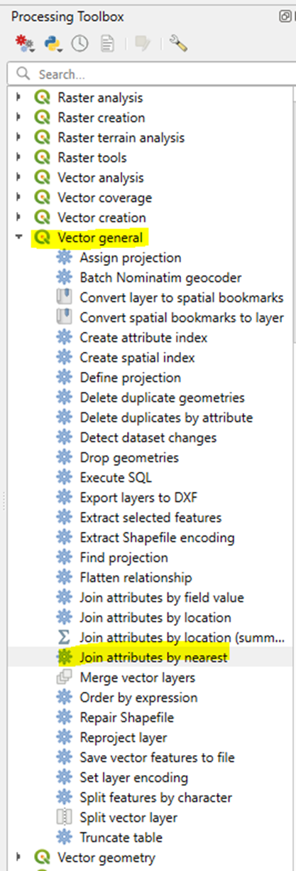 In QGIS, navigate to Processing > Toolbox to open the Toolbox. In the Toolbox, select Vector General > Join attributes by nearest.