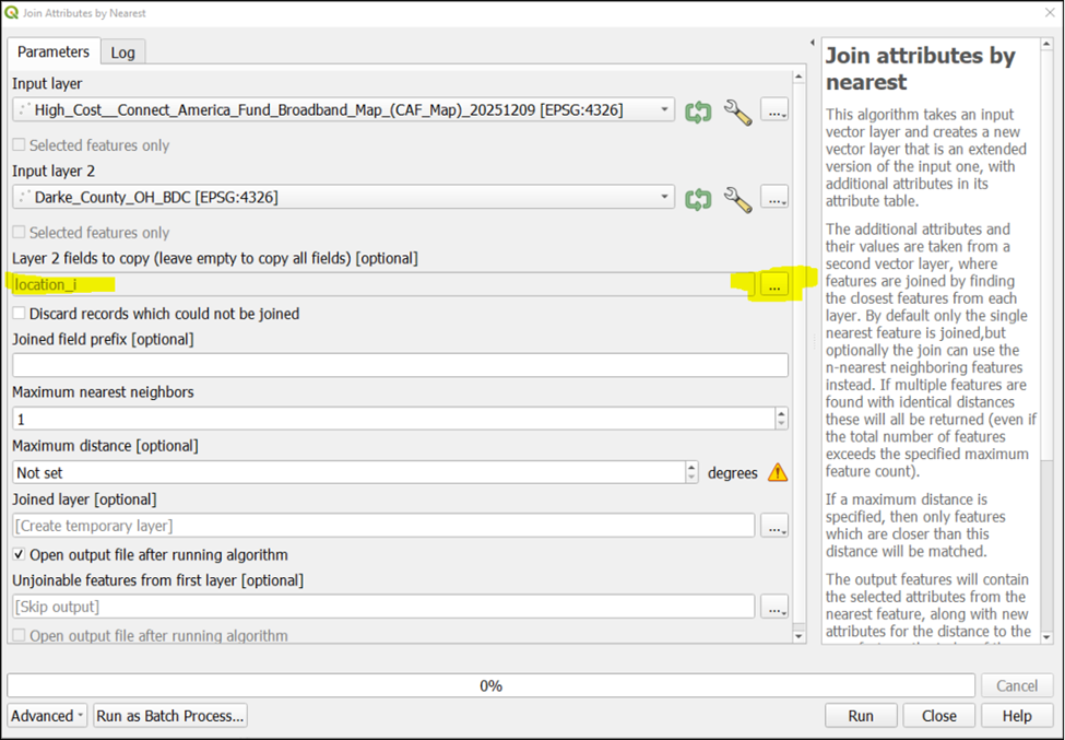 - To associate only the Broadband Serviceable Location (BSL) ID with your HUBB points (without carrying over all the attributes in the Fabric to the output), select the Location ID field in the “Layer 2 fields to copy...” field.