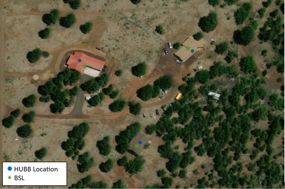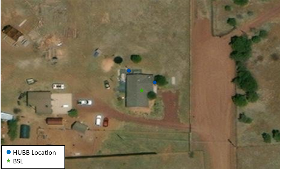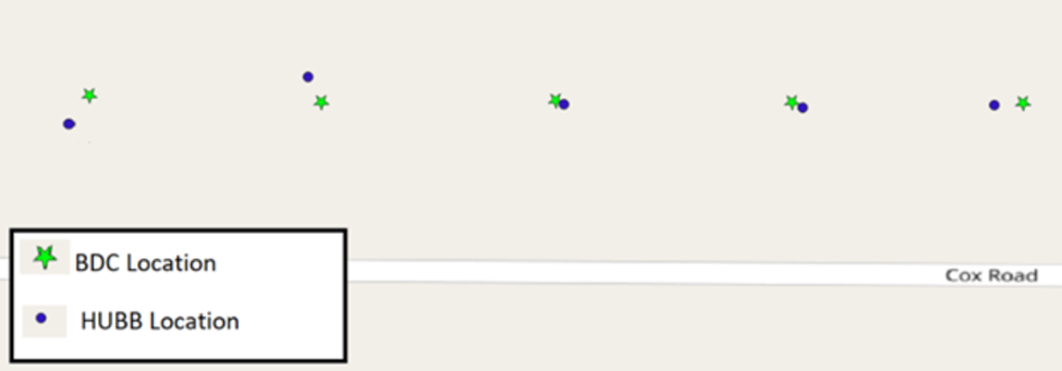 - HUBB locations are not well matched to BSLs – Here, while one HUBB location is well matched to the Fabric, the HUBB location to the north is not on a structure and would not qualify as a BSL.