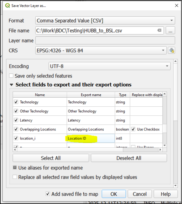 In the “Save Vector Layer as...” window, select Comma Separated Value [CSV] as the Format type. Give your file an appropriate name and optionally edit the Export name text as shown below, so you can easily identify which IDs belong to HUBB and to BSL location in your exported table.