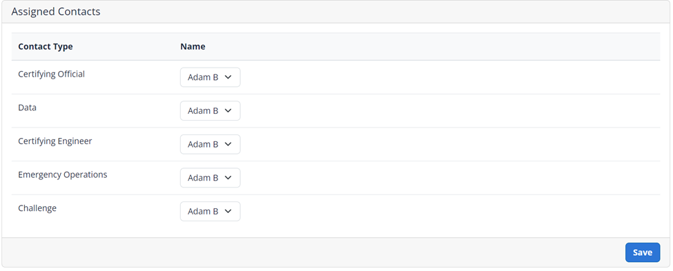 A continuación, usted puede asignar el contacto a través de la sección Contact Type (quiere decir "Tipo de Contacto" en inglés) situada en la parte inferior de la página, como se muestra a continuación. Seleccione el menú desplegable para cada tipo y elija el nombre de contacto apropiado para ese tipo. Haga clic en Save (quiere decir "Guardar" en inglés).