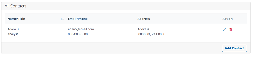 Si el contacto es un funcionario certificador, puede marcarse la casilla This contact may be a Certifying Official. A continuación, usted deberá introducir la dirección del funcionario certificador. Haga clic en Save (quiere decir "Guardar" en inglés). La información del contacto se añadirá al listado All Contacts (quiere decir "Todos los Contactos" en inglés) que se encuentra en la parte superior de la página.