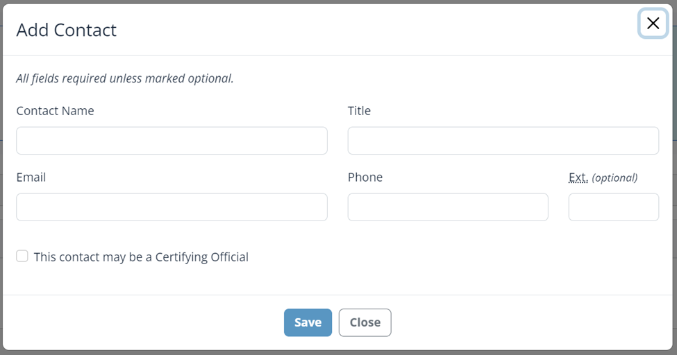 - Certifying Official (quiere decir "Contacto del Funcionario Certificador" en inglés): Introduzca la información de contacto predeterminada del funcionario cuya firma certifica la validez de la información contenida en una presentación. Puede especificar el contacto de un funcionario certificador diferente para cada presentación.