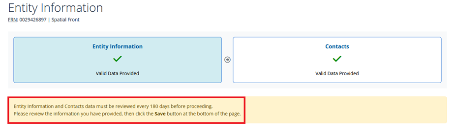 Además, aparecerá un mensaje en los cuadros de Entity Information (quiere decir "Información de la entidad" en inglés) y Contacts (quiere decir "Contactos" en inglés) de la página Información de la entidad indicando que es necesario actualizar la información. Revise la información, actualícela si es necesario y haga clic en Save (quiere decir "Guardar" en inglés).